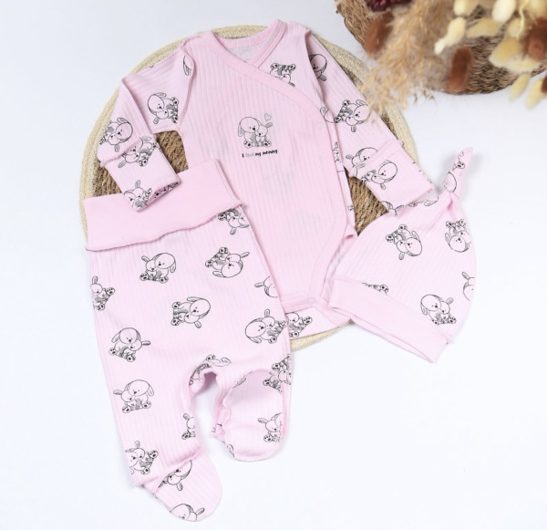Комлект для дівчинки, складається з трьох частин: боді + повзуни + шапочка. Виробництво Україна. 100% бавовна.