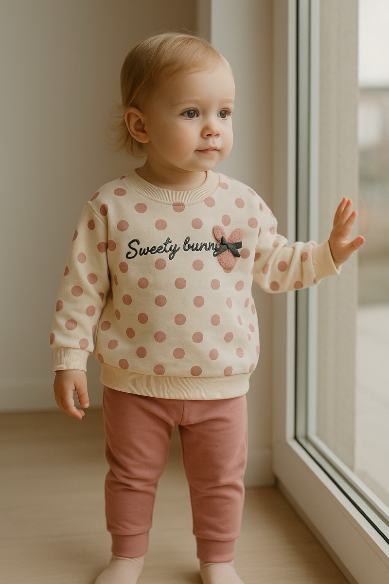 Костюмчик для маленької дівчинки в горошок, пудрово-рожевого кольору. Прикрашений милим зайченям. Без утеплення