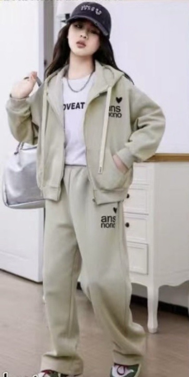Костюм для дівчинки. Кофта має блискавку та катюшон, брюки палаццо, знизу на штаніні куліска, яку по бажанню можна стягнути. Тканина плотний трикотаж. Весь костюм всипаний маленькими стразами, які гарно тримаються. Колір оливковий.