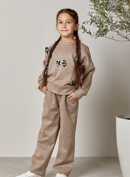 Замшевий костюм для дівчинки: світшот, прикрашений бантиками + штани. Розміри повномірні та відповідають зросту дитини.