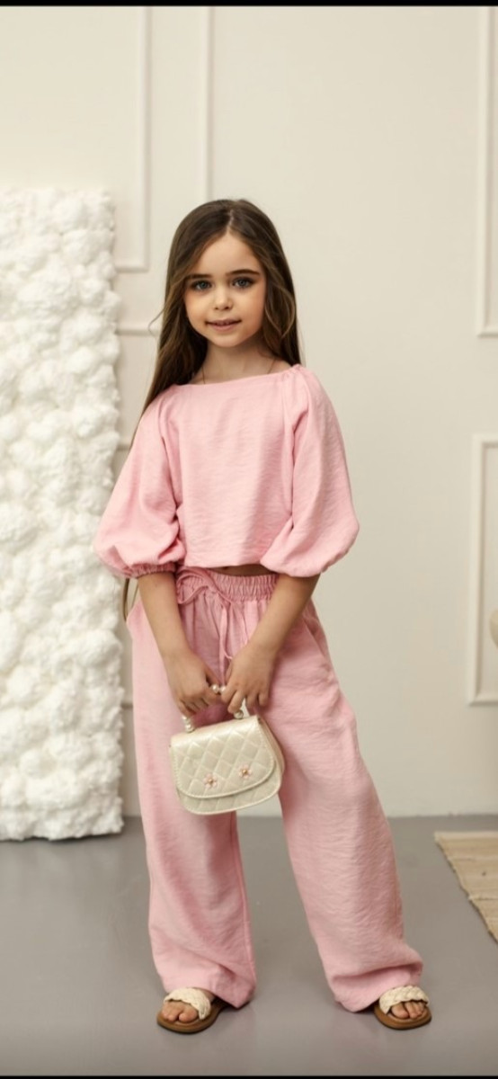 Легкий дихаючий костюм для дівчат з брюками палаццо і укороченою блузою. Рукав 3 чверті з резинкою. Горловина ззаду має виріз, який регулюється. Брюки на резинці, шнурівка для прикраси. Тканина льон - жатка. Розміри відповідають зросту дитини.