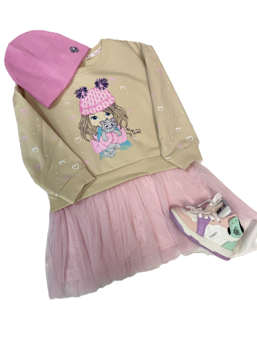 Сукня з імітацією світшота. Фатінова спідниця на бавовняній підкладці і світшот. Виглядає дуже стильно і незвично. Верх виконаний у бежевому кольорі з милим малюнком. Низ з рожевого фатіну. Сукня вільного крою.