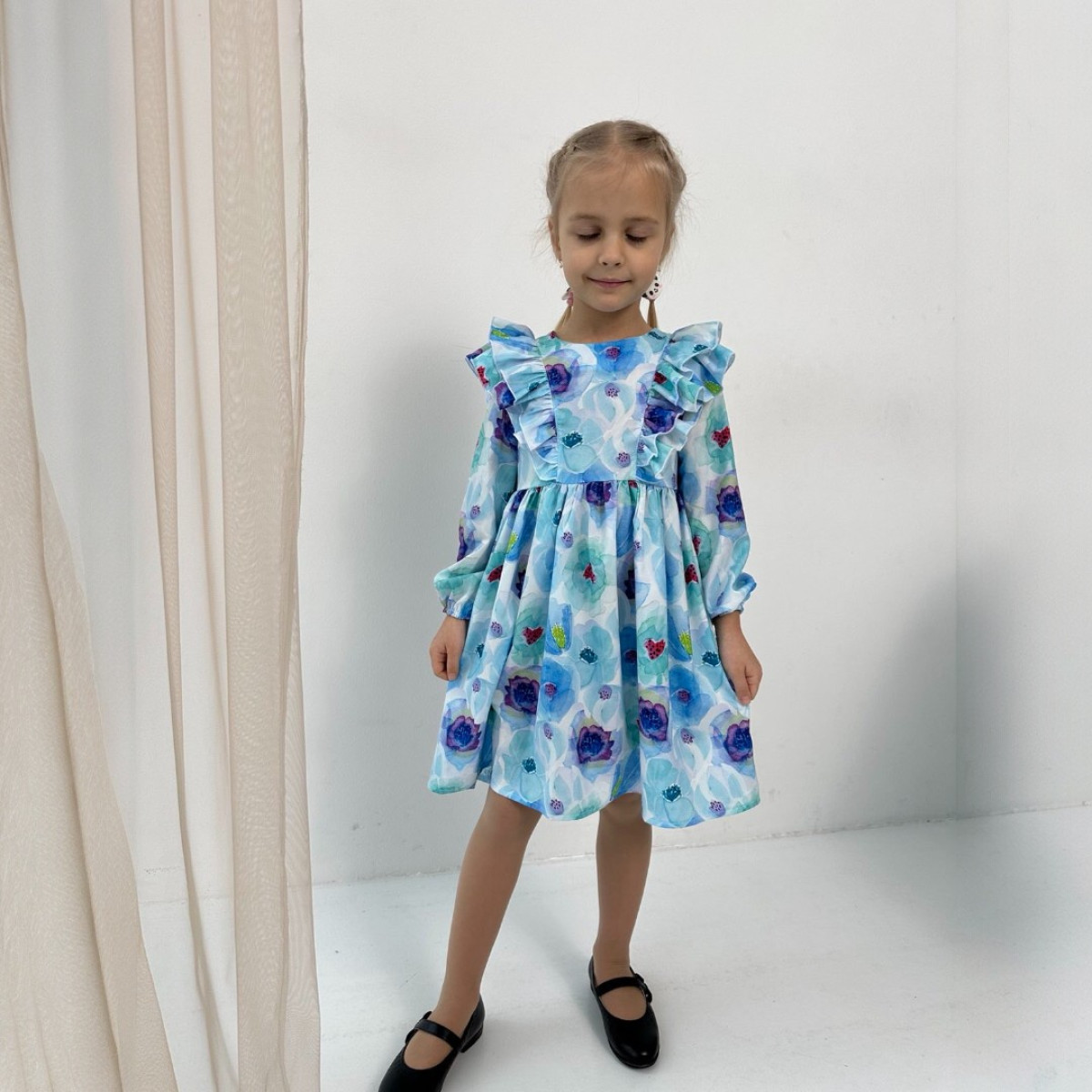 Легка та нарядна сукня , прикрашена рюшами, зав'язується на пояс. Розмір відповідає зросту дитини.