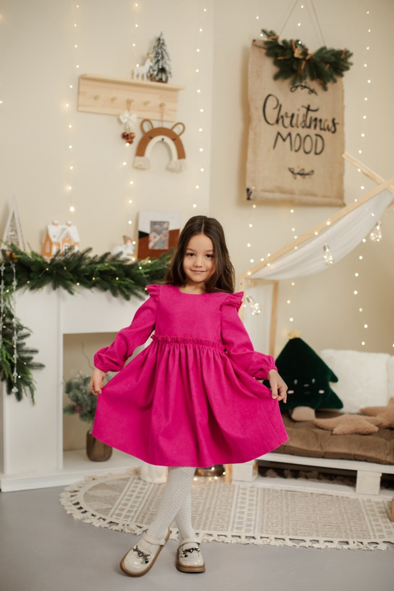 Сукня виготовлена з мікровельвету. Колір малиновий. Ззаду застібається на гудзики. Підійде як для свята, так і на кожен день.